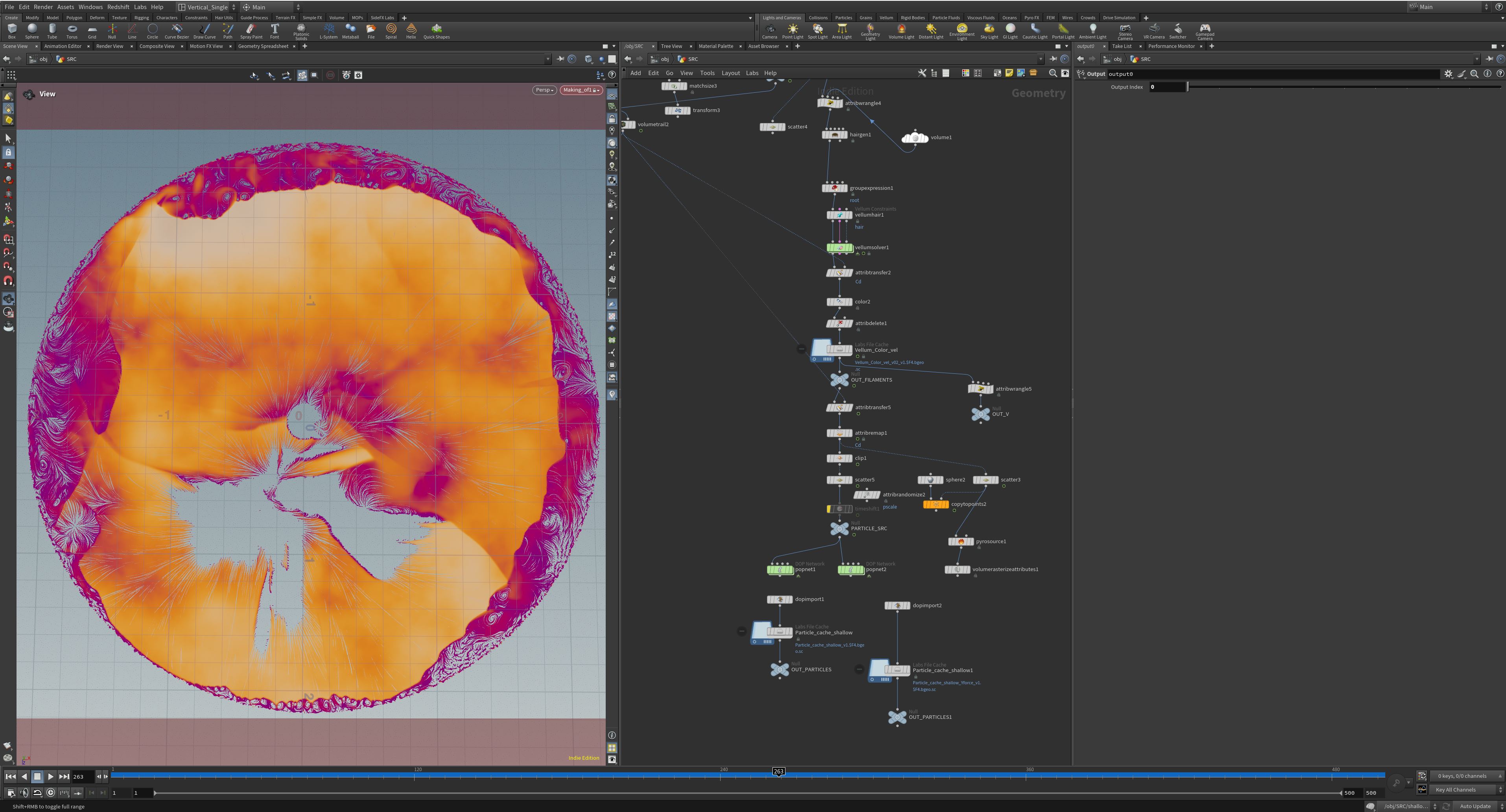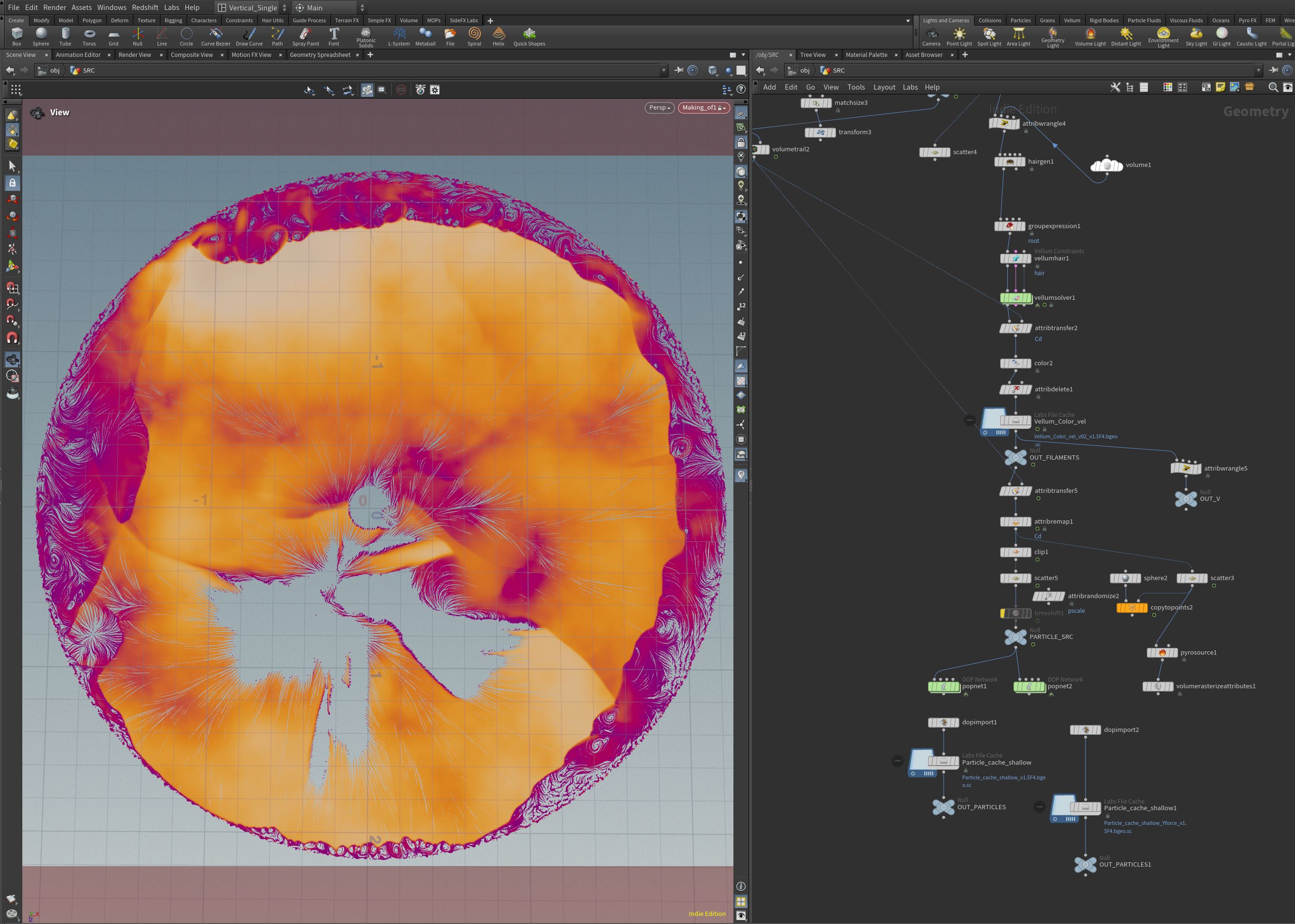 The setup came together quickly and served as a rich exercise in cross-pollination within Houdini. By allowing Heightfields, Vellum, and DOPs to interact, I was able to stack effects in unexpected ways, building a system where motion and color emerge naturally from shared forces. The result is a layered, interconnected simulation that yields both intricate dynamics and a uniquely striking visual beauty.